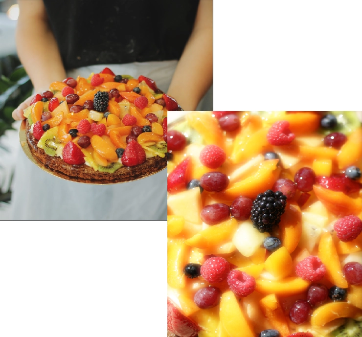Une base croustillante garnie d’une crème légère, recouverte d’un assortiment généreux de fruits frais : fraises, framboises, mûres, raisins, kiwis, ananas et abricots. Chaque bouchée offre une explosion de saveurs et de textures, entre acidulé, sucré et juteux. Un hommage à la nature dans toute sa diversité, idéale pour les amateurs de fraîcheur et de gourmandise.