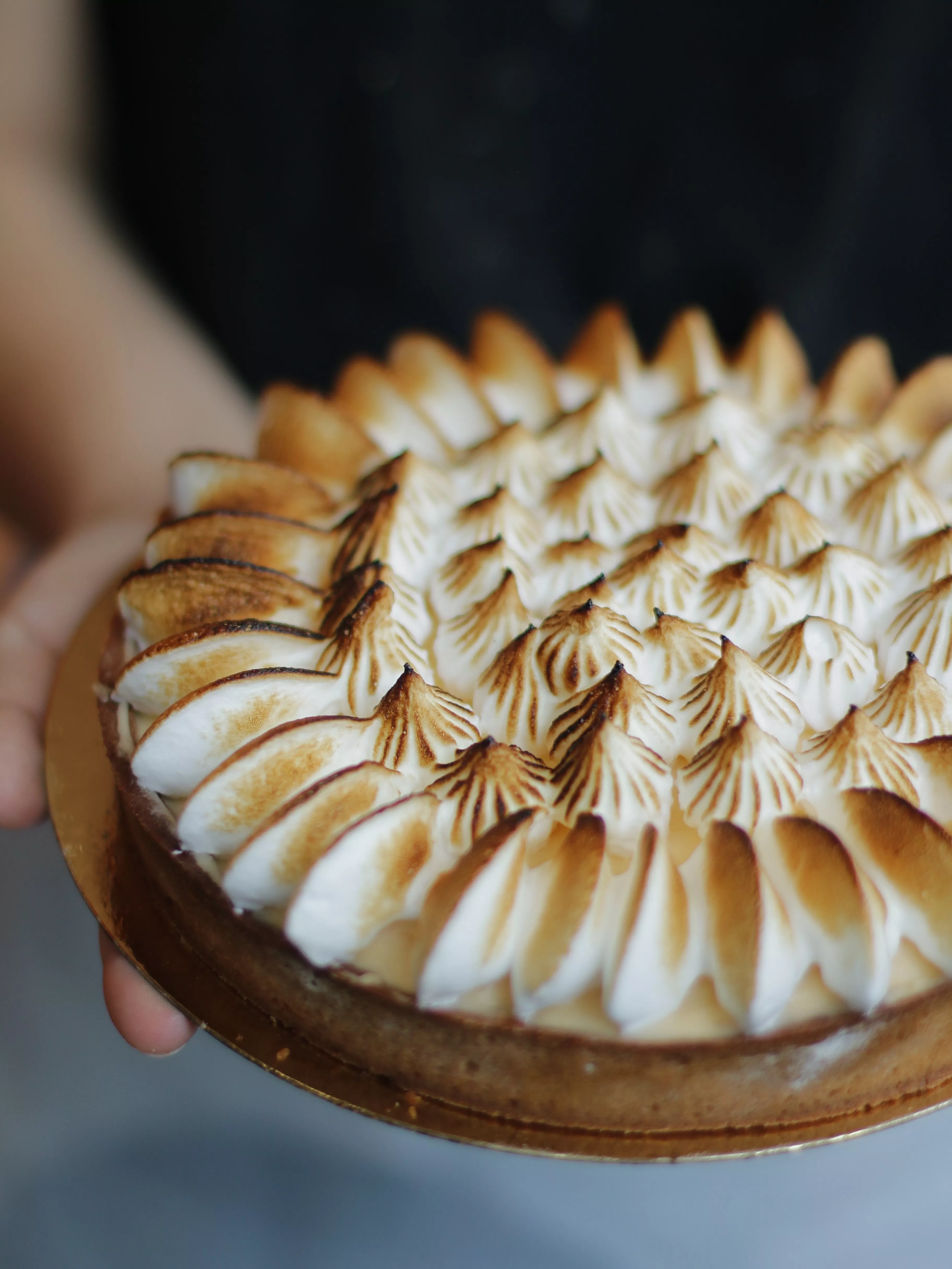 Une pâte sablée dorée garnie d’une crème au citron acidulée, surmontée d’une meringue italienne délicatement pochée et dorée à la flamme. Chaque pointe de meringue révèle un cœur fondant, contrastant avec la vivacité du citron. Un dessert élégant et réconfortant, parfait pour les amateurs de fraîcheur et de finesse.